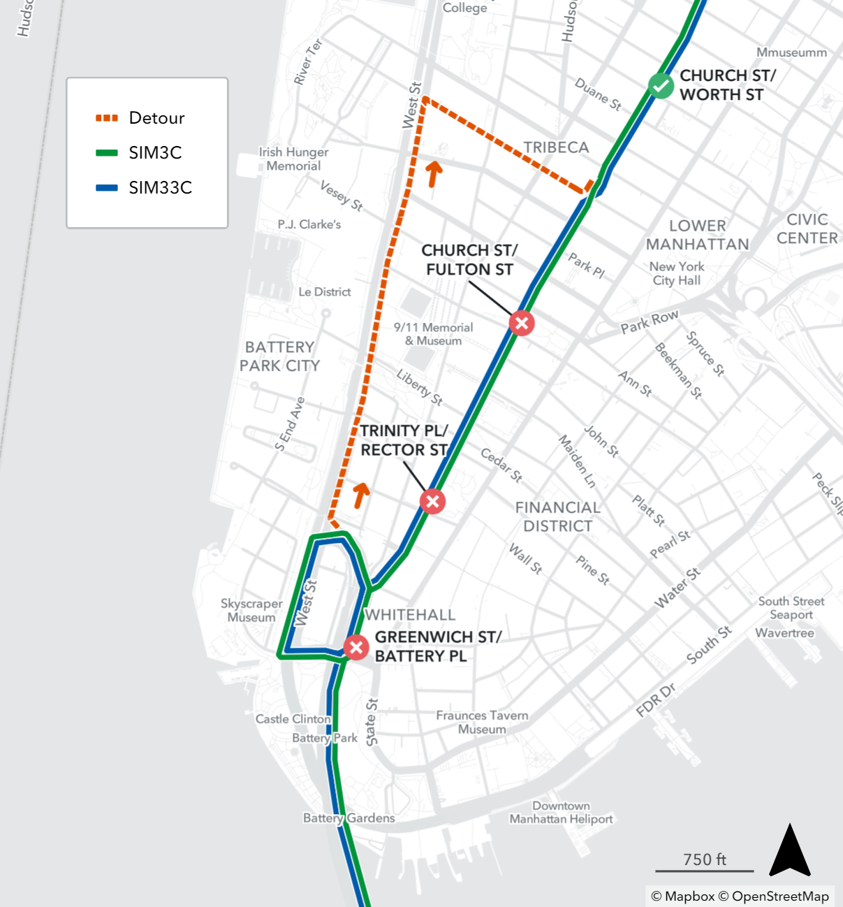 Northbound SIM3C and SIM33C stops on Greenwich St at Battery Pl, Trinity Pl at Rector St and Church St at Fulton St is closed
