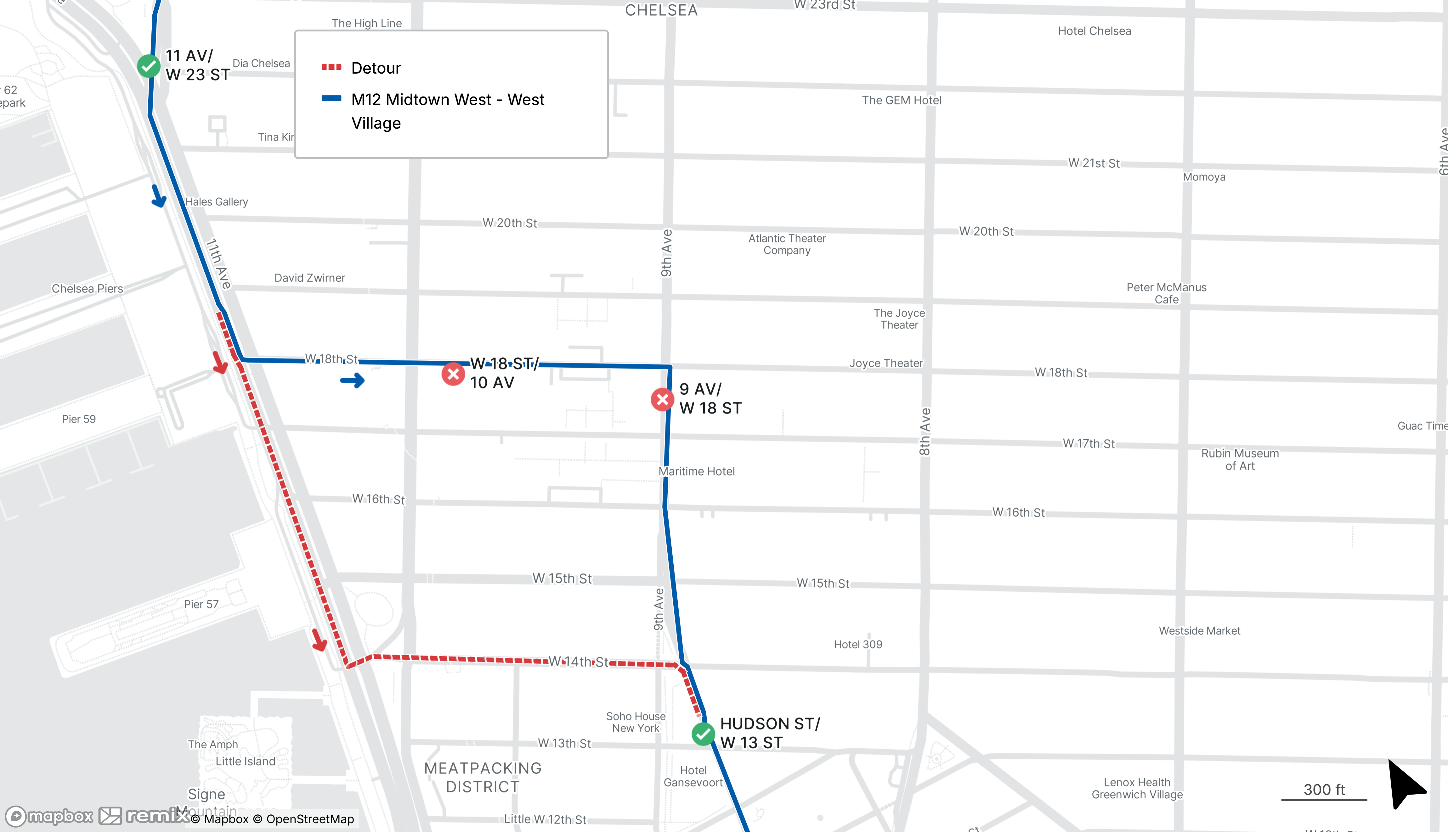 Starts Until Tue Oct 28For service, use the stops on 11th Ave at W 23rd St or Hudson St at W 13th St.
