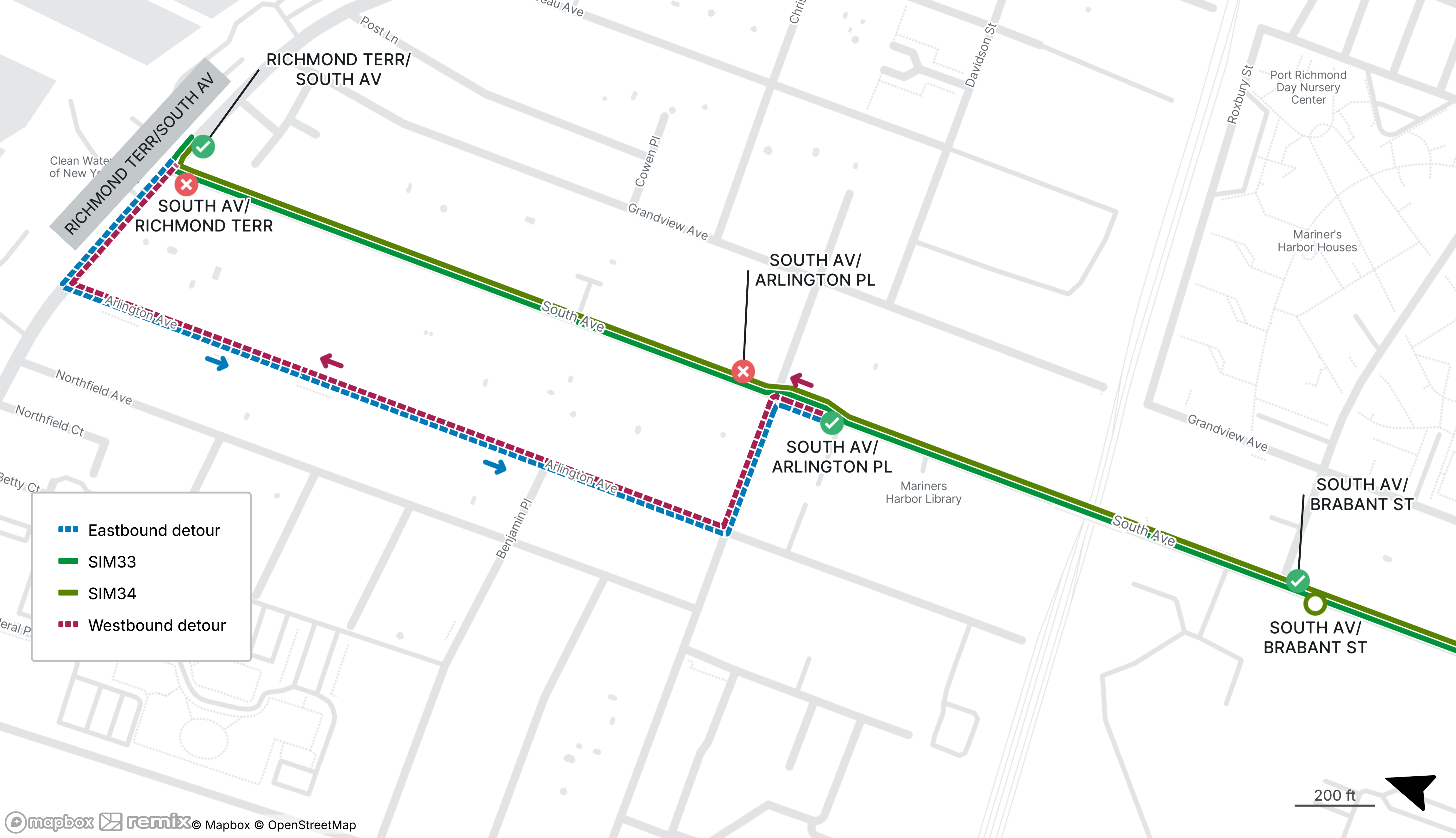 SIM33 and SIM34 buses will be detoured from South Ave between Richmond Terrace and Arlington Place
