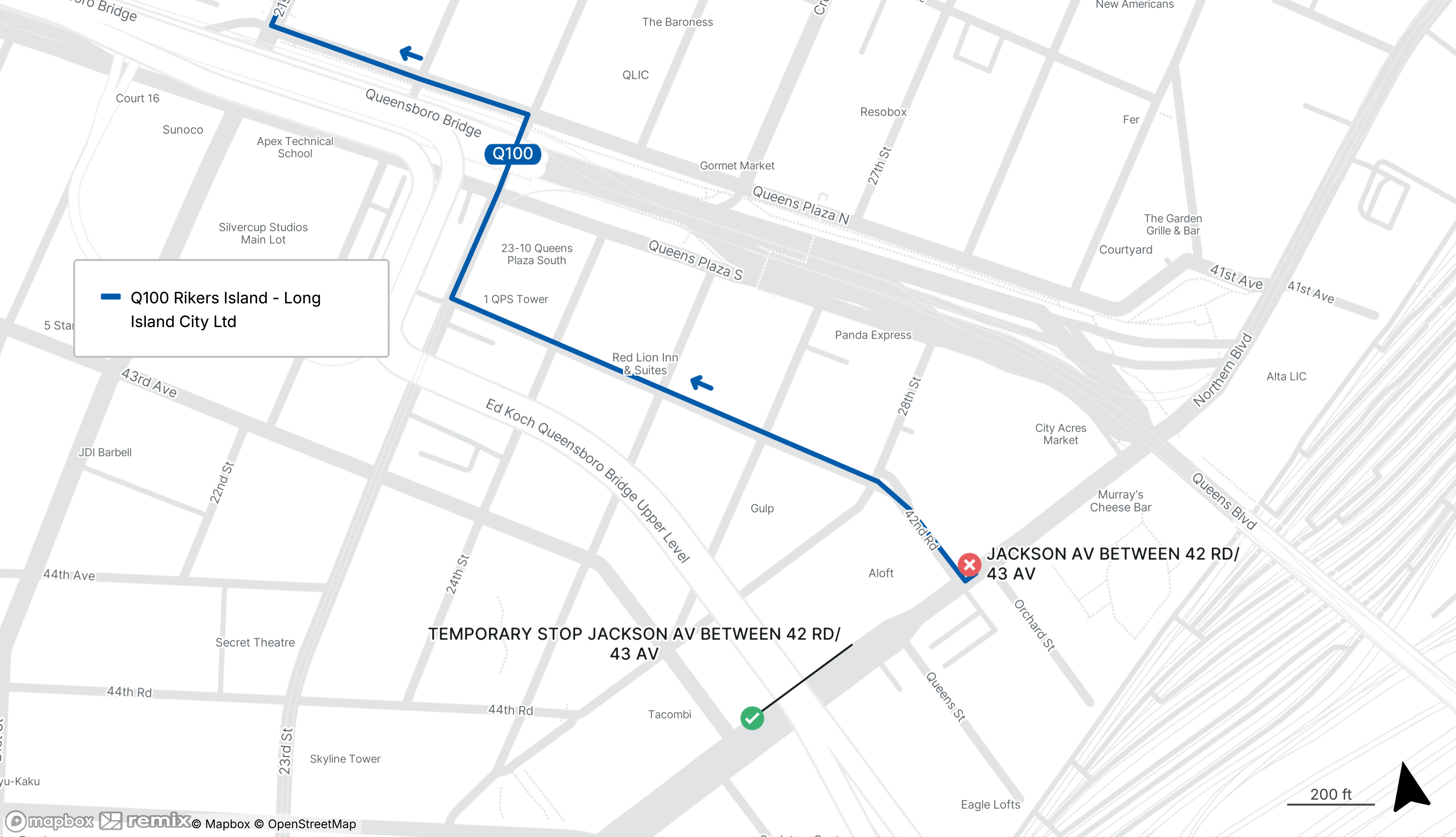 Northbound ‌Q100 limited stop on Jackson Ave at 42nd Rd will be closed, use the temporary stop on Jackson Ave between 42nd Rd at 43rd Ave
