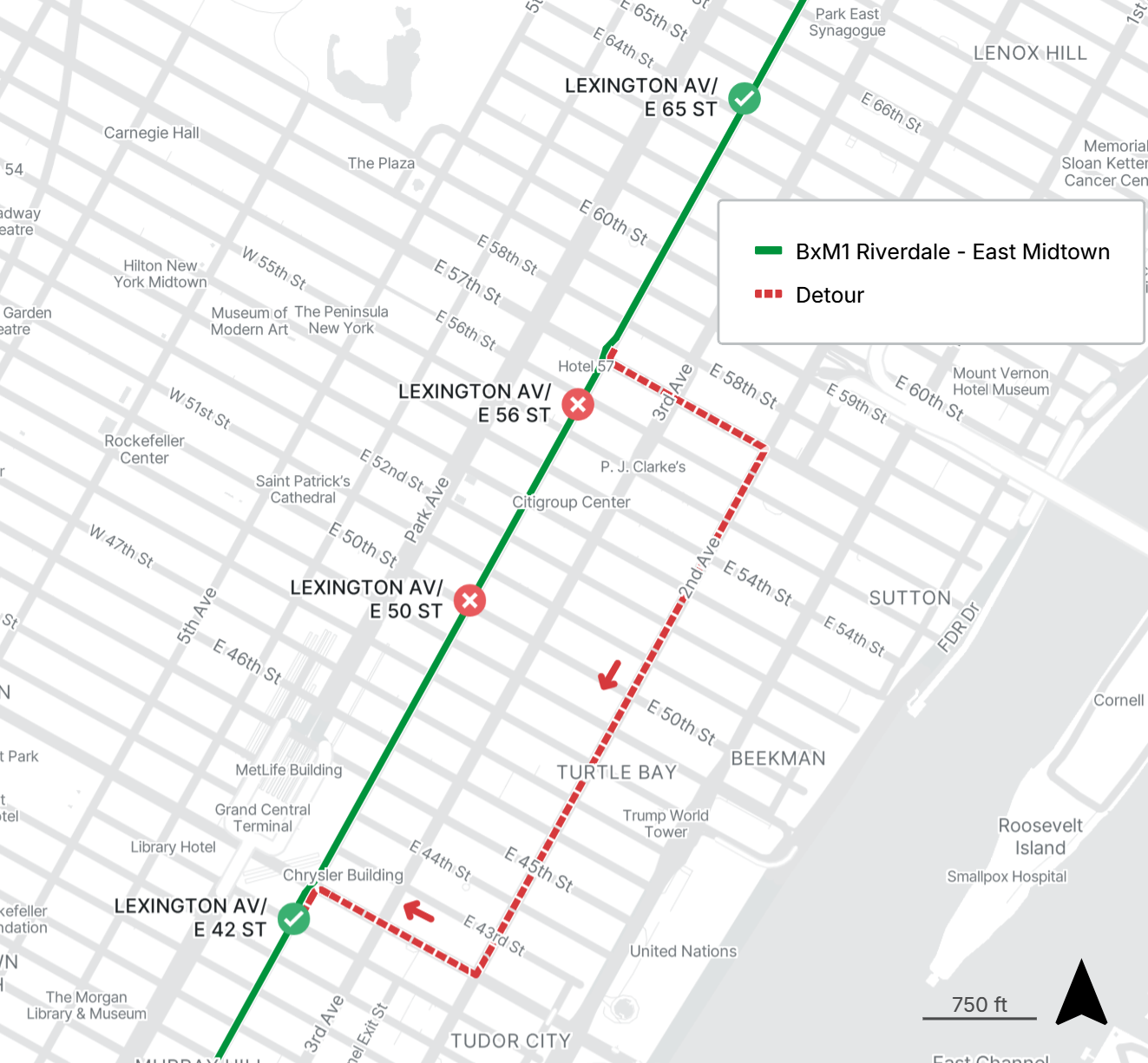 Buses detour via 2nd Ave and make requested stops at E 56th St and E 50th St.