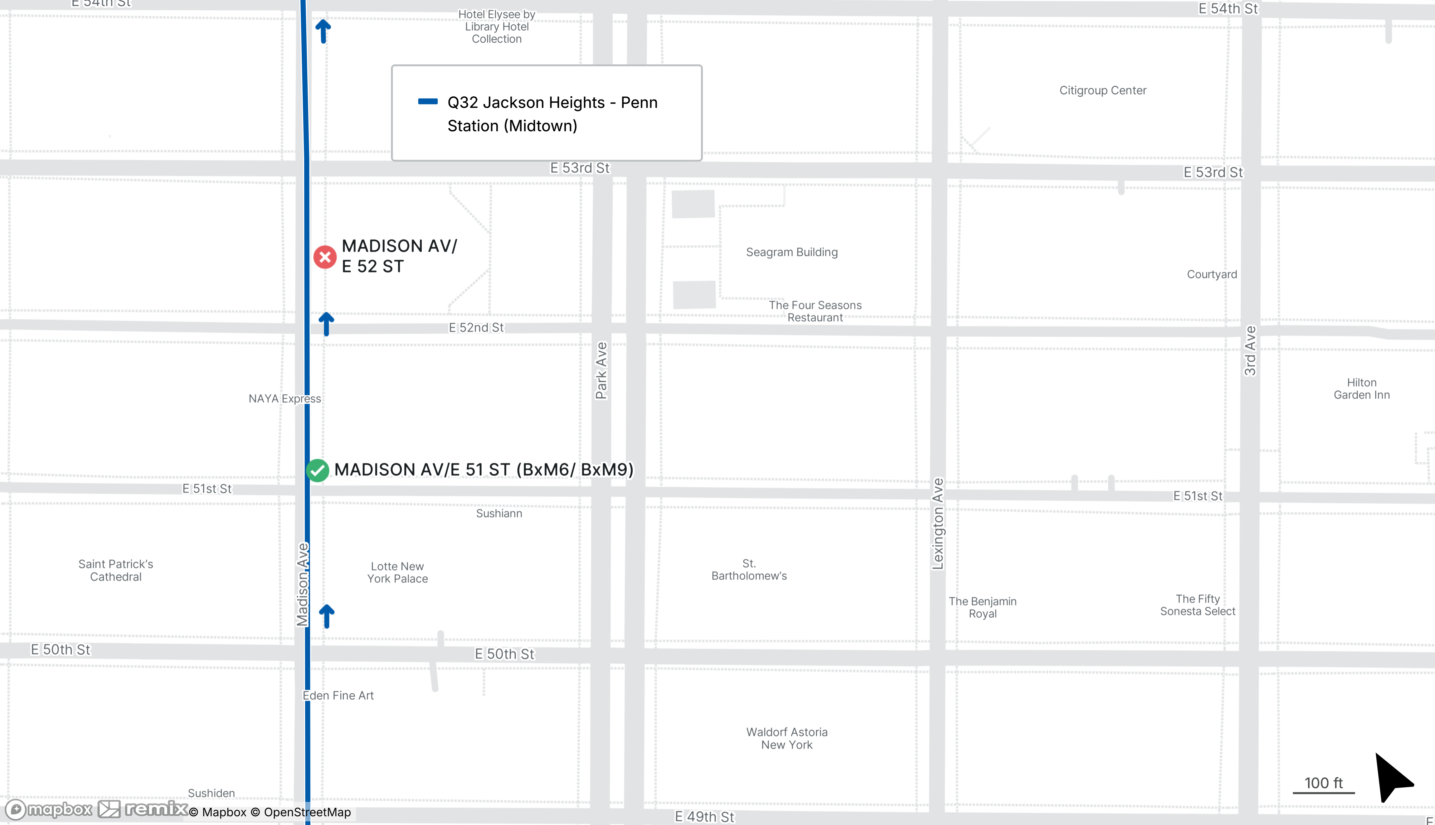 Eastbound Q32 stop on Madison Ave at E 52nd St will be bypassed, use the temporary stop on Madison Ave at E 51st St