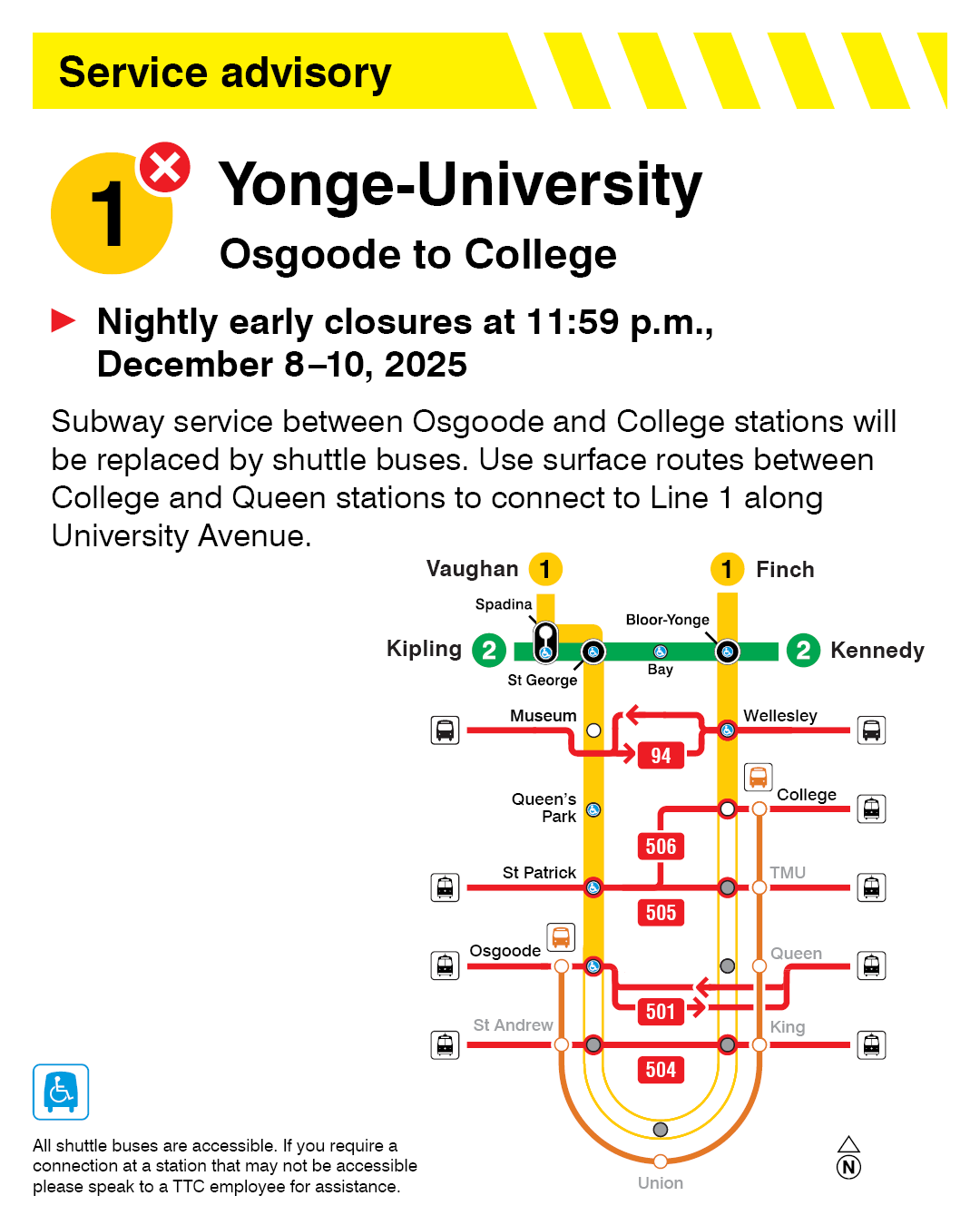 Line 1 Yonge-University: There will be no subway service between Osgoode and College stations, starting 11:59 p.m., nightly Monday, December 8 to Wednesday, December 10, due to planned track work. Shuttle buses will operate. Started Until Wed Dec 10 (Updated )