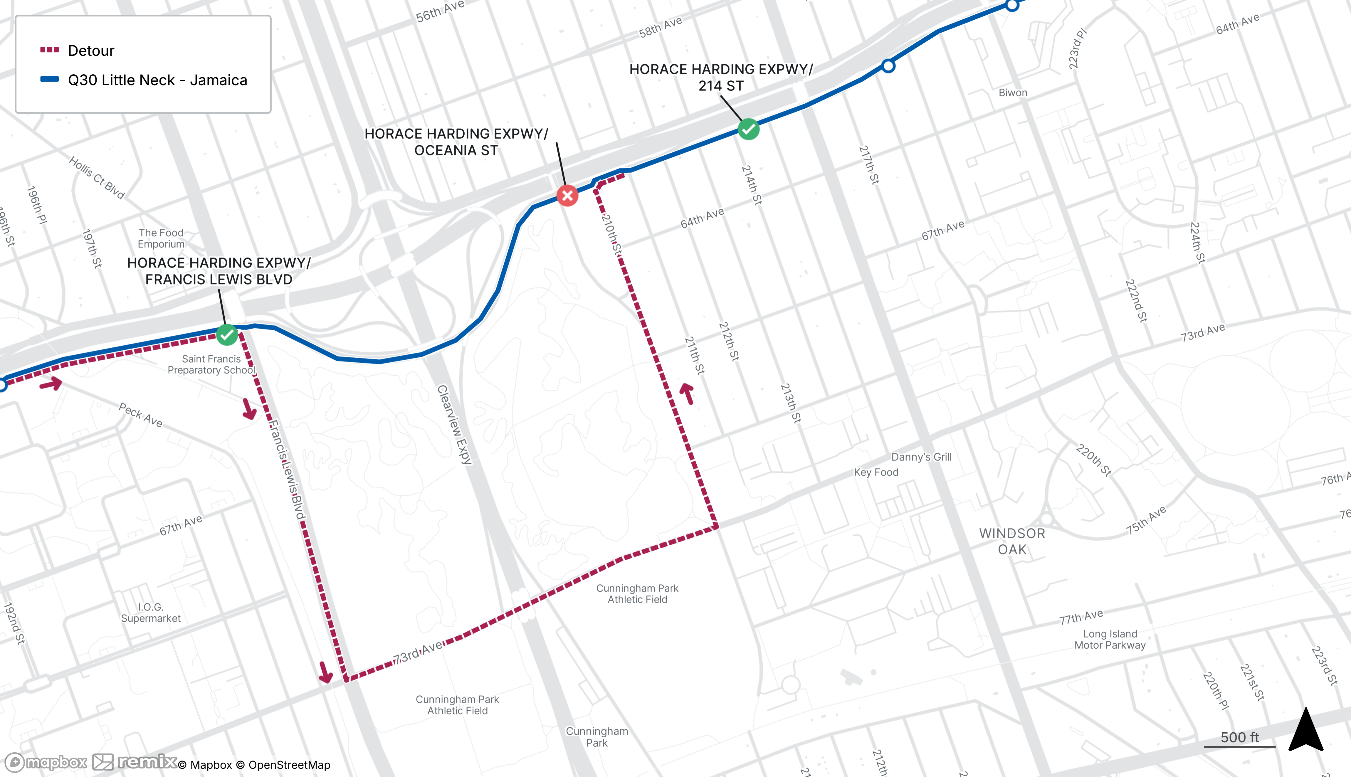 Eastbound Q30 stop on Horace Harding Expressway at Oceania St will be closed, use the stops on Horace Harding Expressway at Francis Lewis Blvd or 214th St