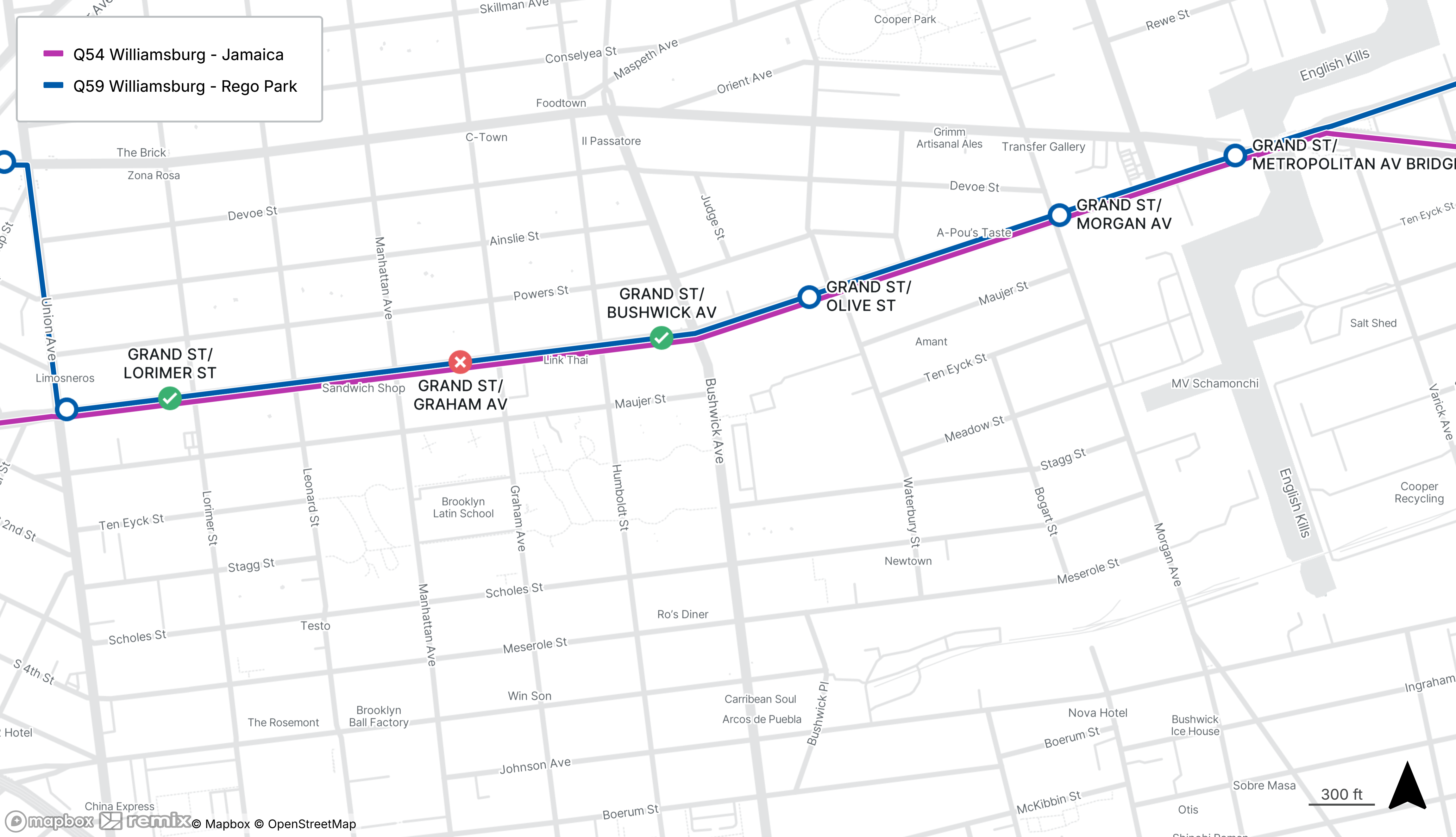 Williamsburg-bound Q54 and Q59 buses are bypassing the stop on Grand St at Graham Ave