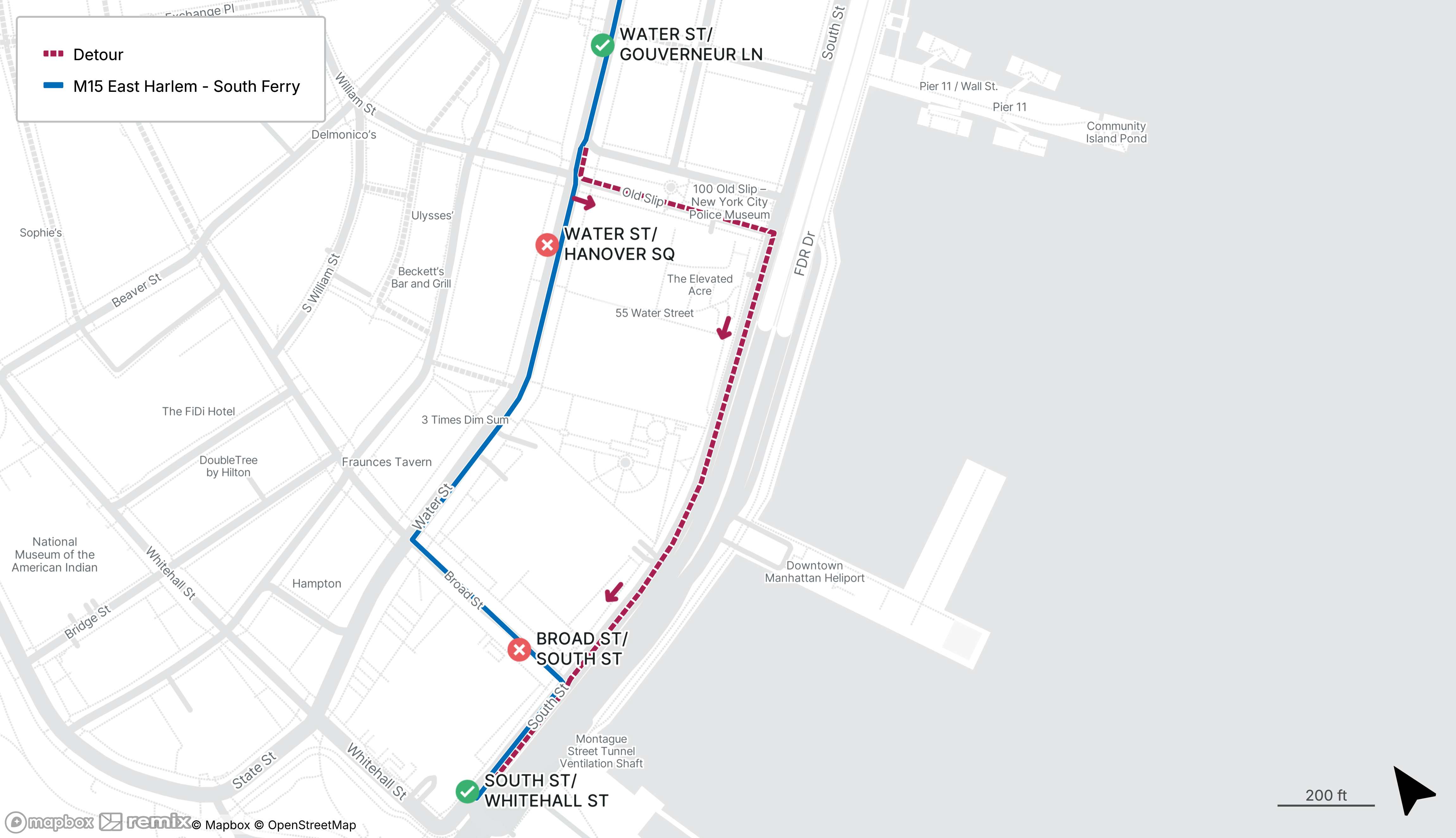 Southbound M15 stops on Water St at Hanover Square and Broad St at South St are closed