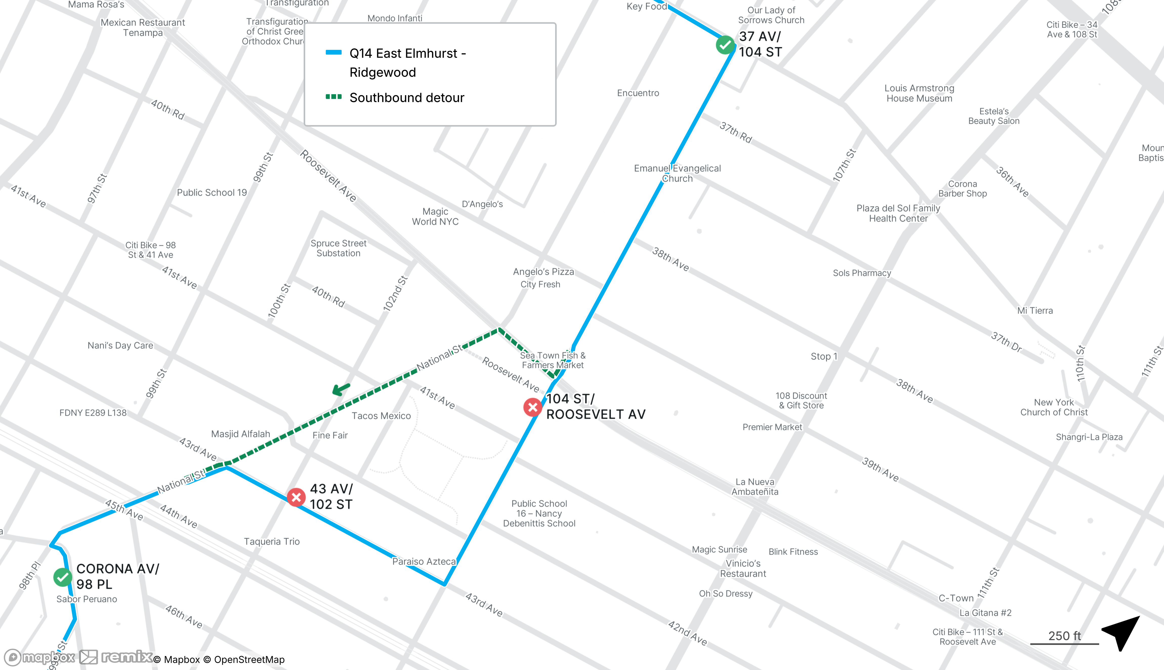 Southbound Q14 stops on 104th St at Roosevelt Ave and 43rd Ave at 102nd St will be closed