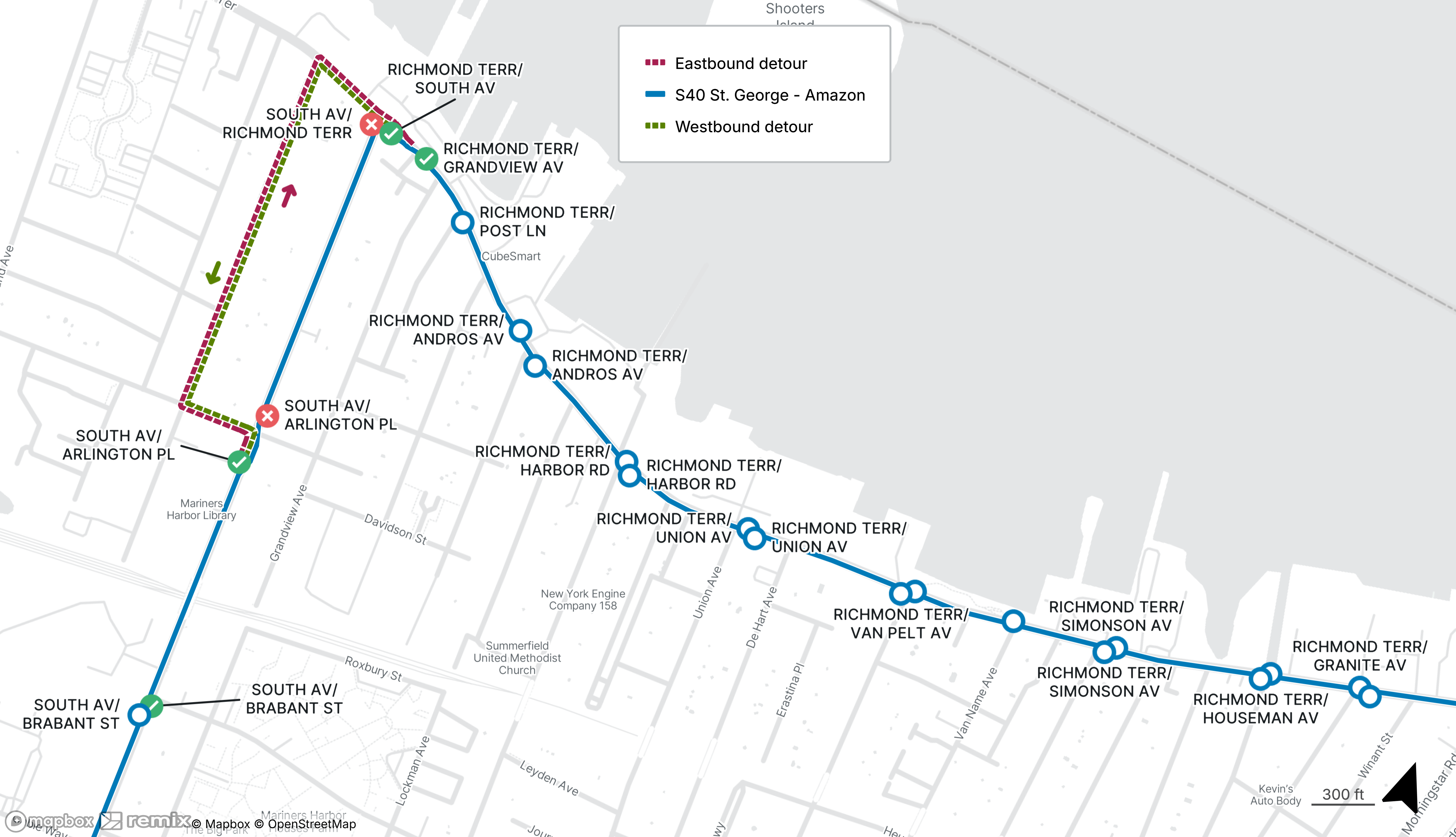 S40 buses are detoured in both directions between South Ave at Arlington Place and Richmond Terrace at Arlington Ave.
