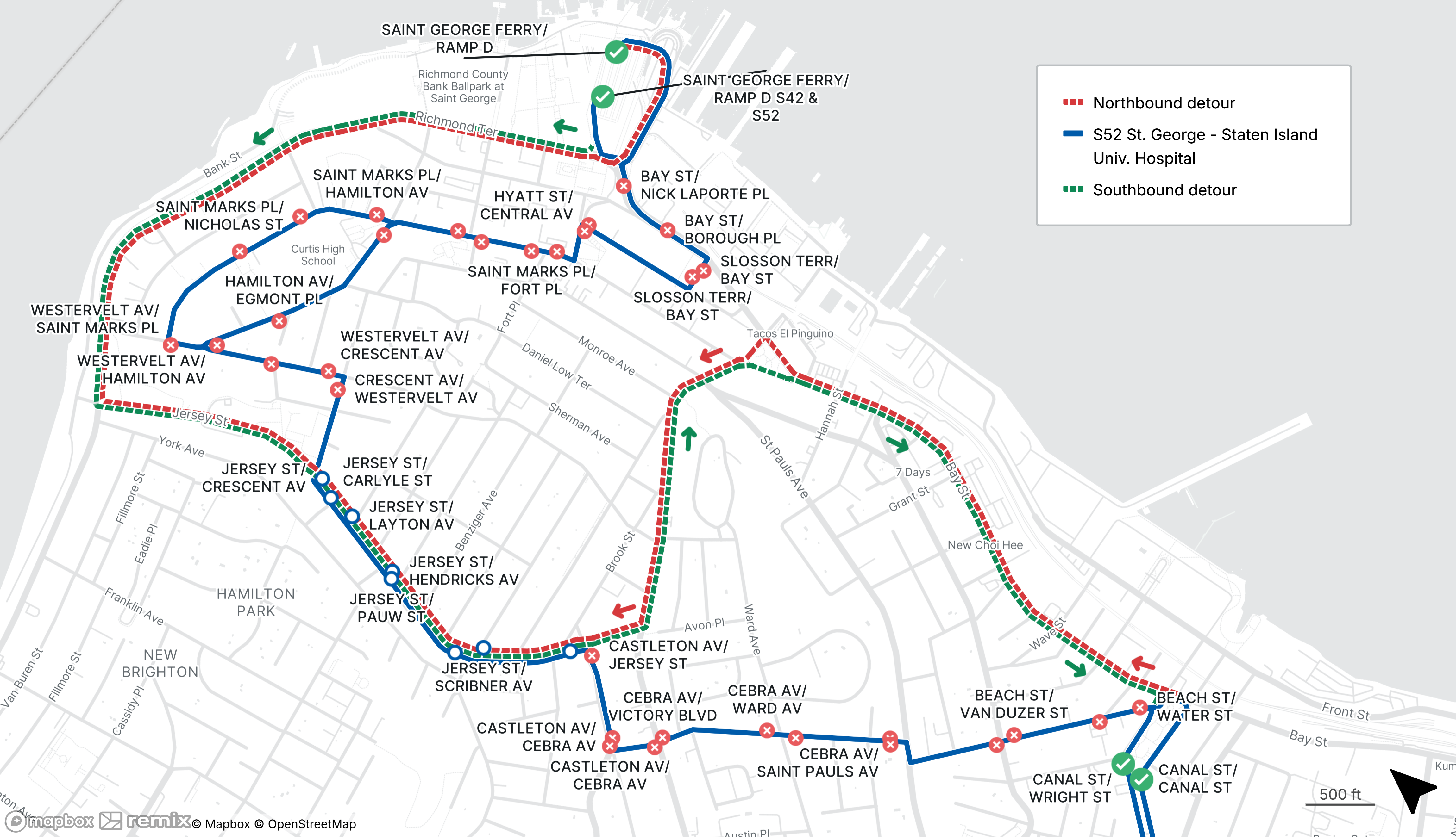 S52 buses will be detoured between Bay St at Victory Blvd and Ferry Terminal Viaduct at Richmond Terrace