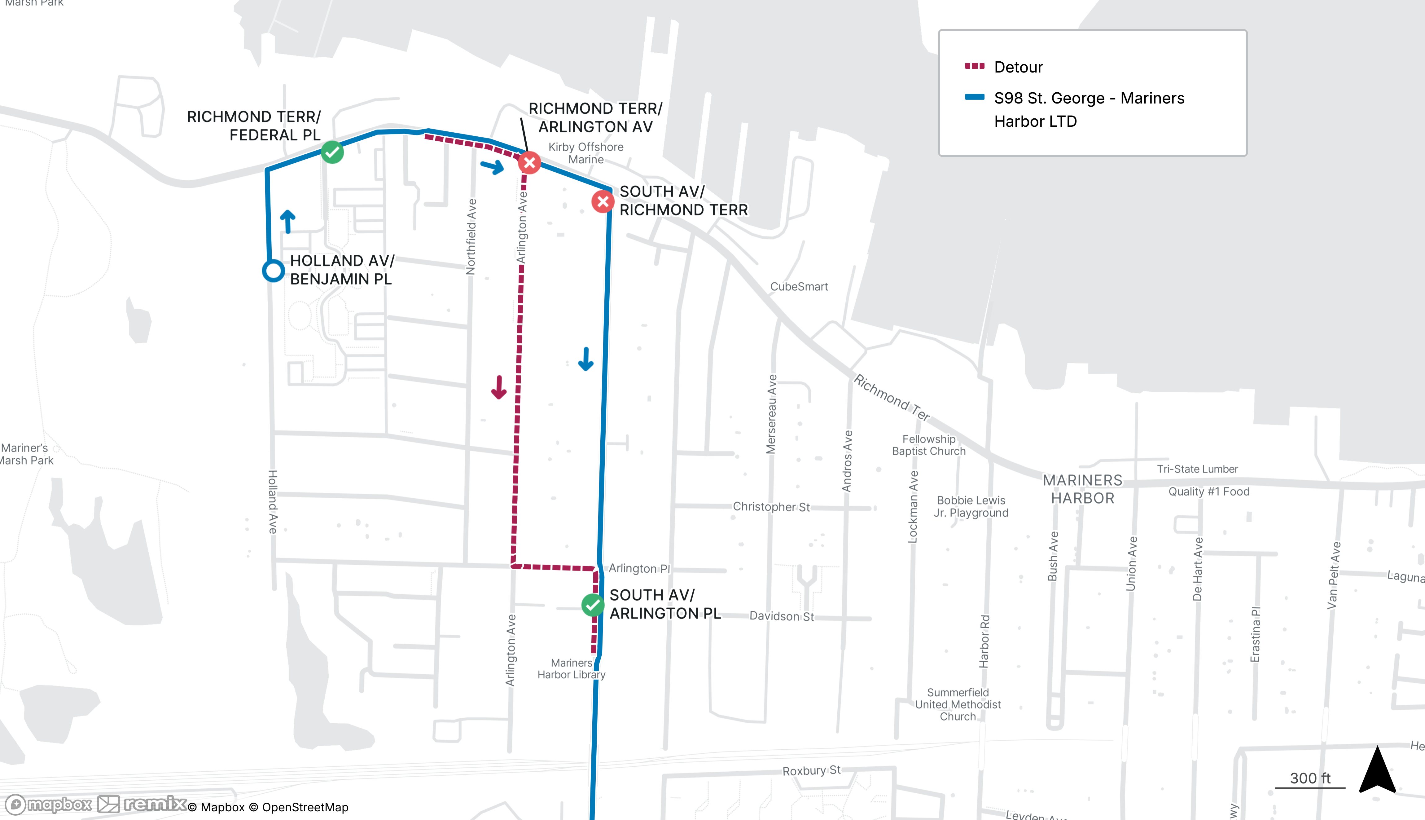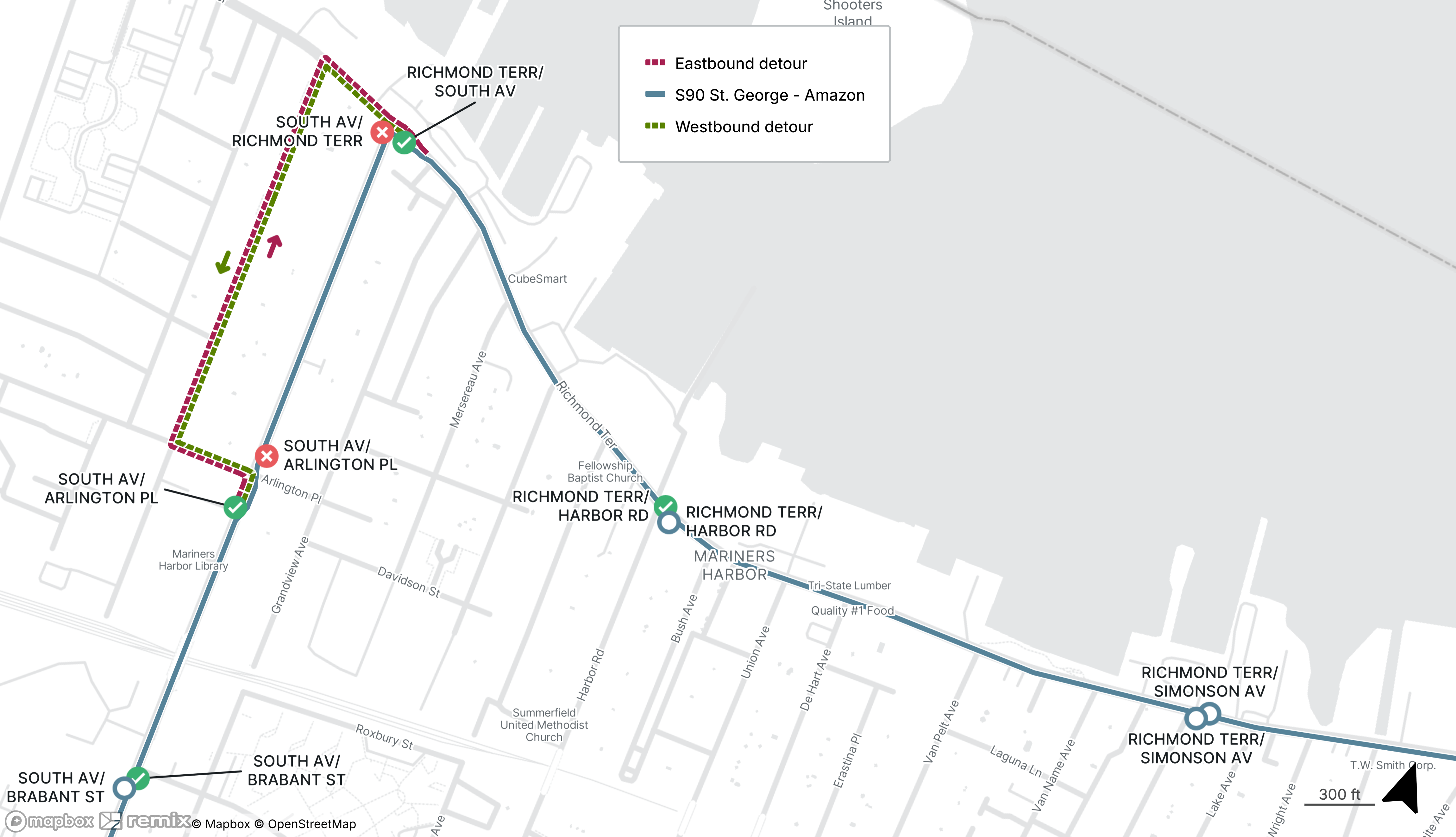 S90 buses are detoured in both directions between South Ave at Arlington Place and Richmond Terrace at Arlington Ave.