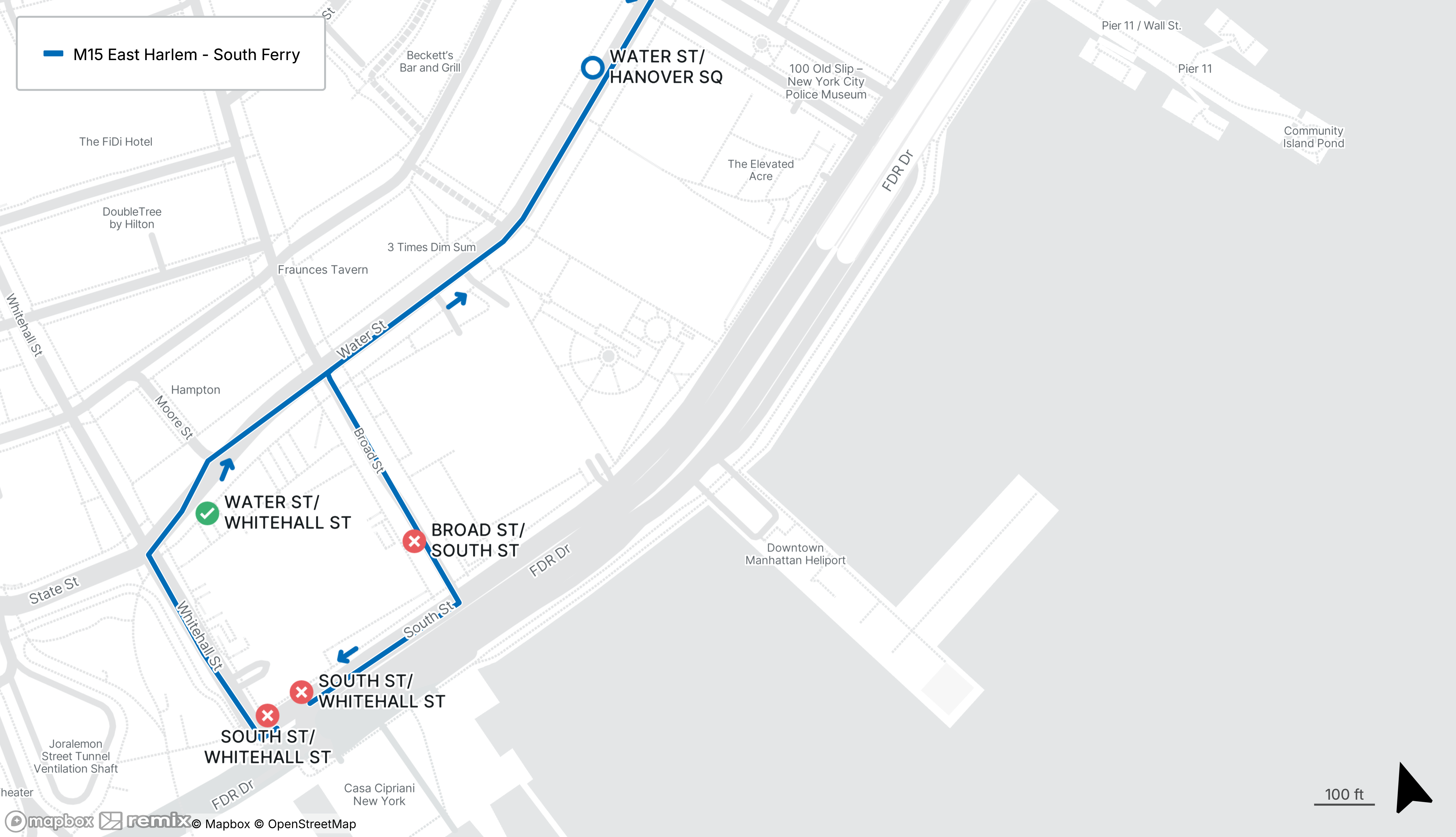 M15 stops on South St at Whitehall St in both directions and southbound stop on Broad St at South St are closed
