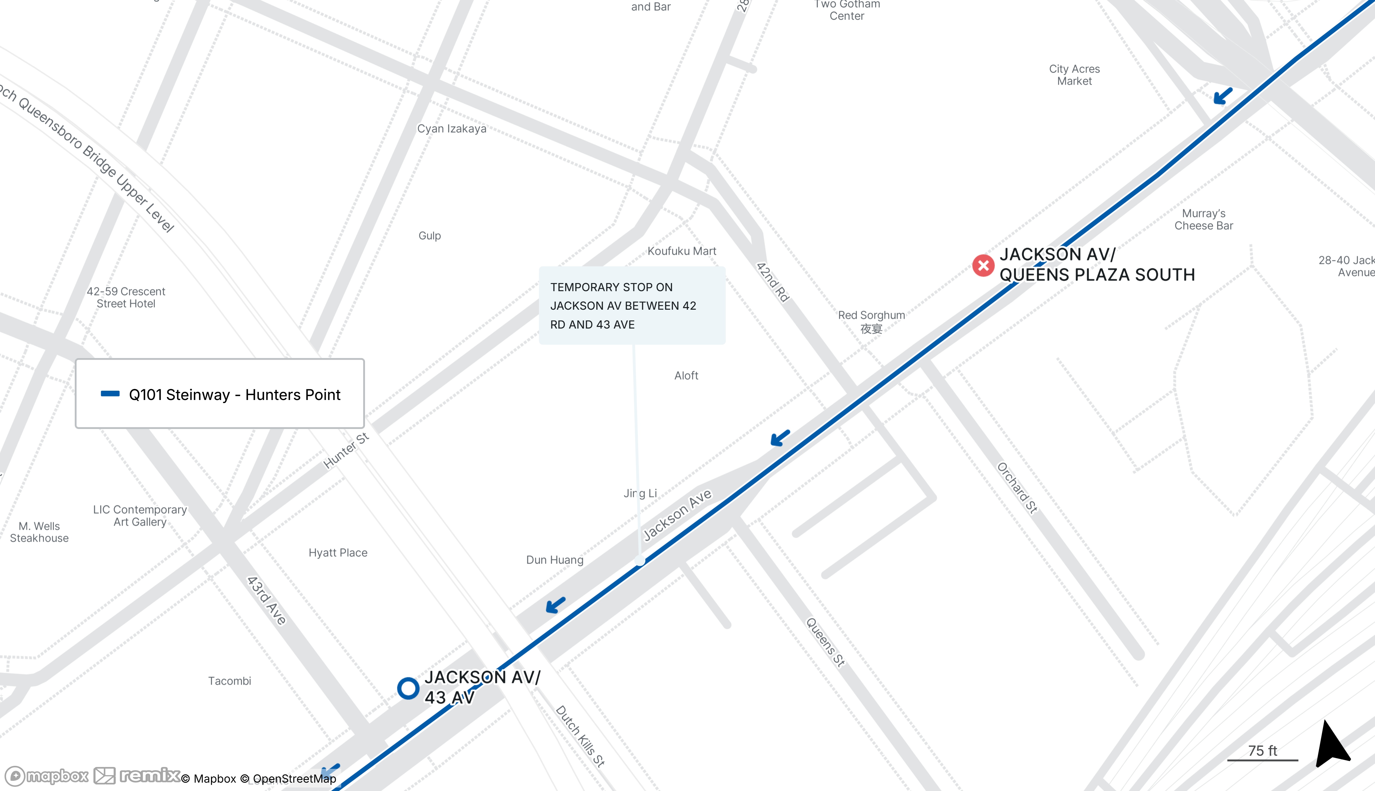 Northbound Q101 stop on Jackson Ave at Queens Plaza South will be closed, use the temporary stop on Jackson Ave between 42nd Rd at 43rd Ave