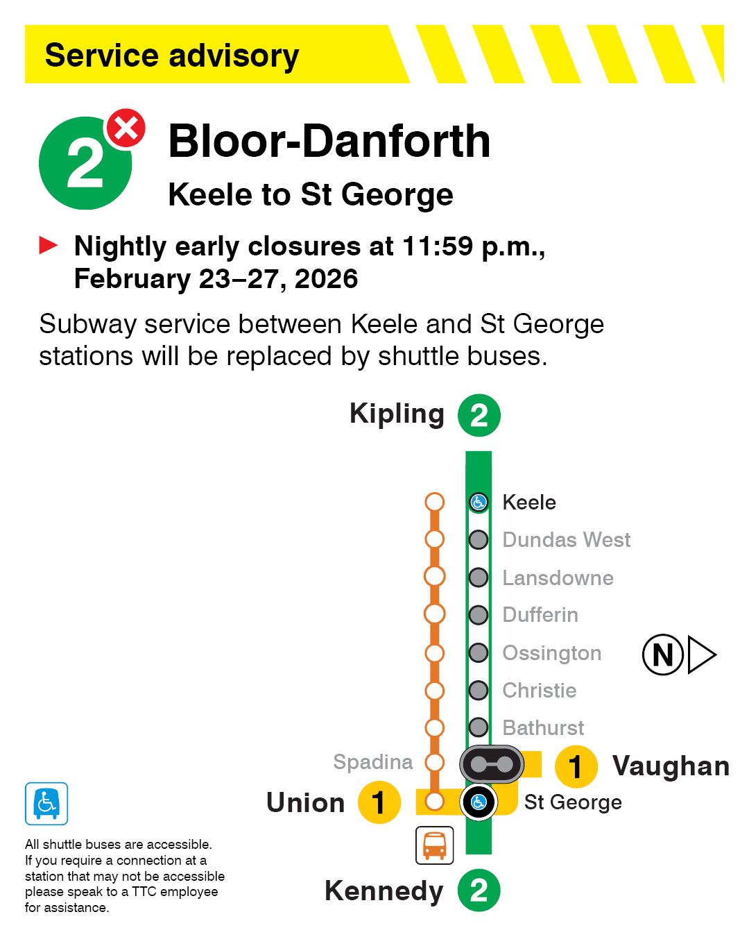 Line 2 Bloor-Danforth: There will be no subway service between Keele and St George stations, starting 11:59 p.m., nightly Monday, February 23 to Friday, February 27, due to planned track work. Shuttle buses will operate.